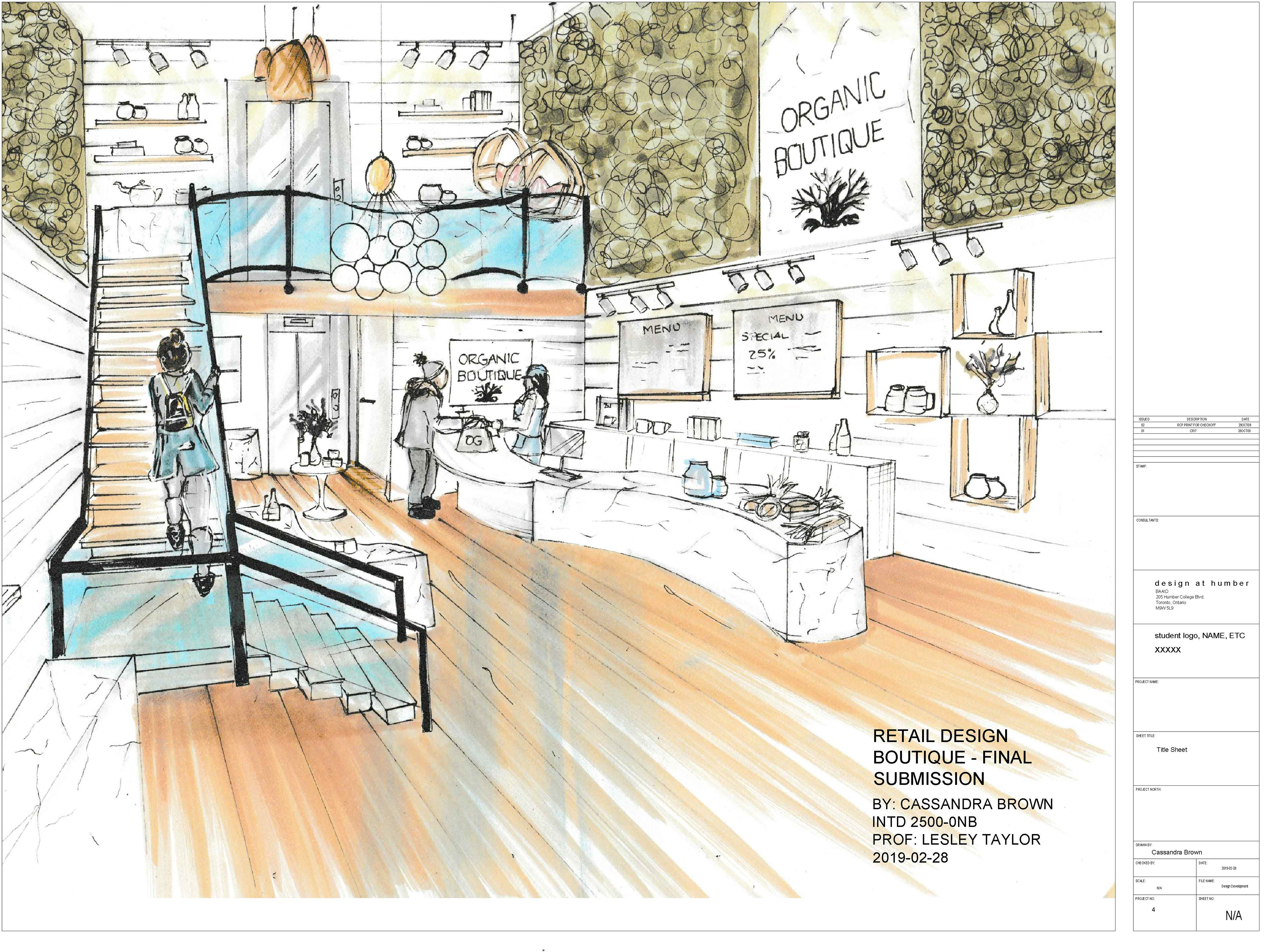 Proposed retail design for Queen Street retail building. Currently known as Abrahams Mirror Plus, an Antique store. Plans created on AutoCAD and hand rendered